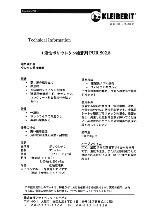 木材・内装や外装用合板・無機建築材料ボード・セラミック材料・コンクリート材料・硬質フォームの接着等に使用できます。